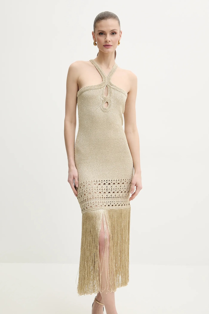 Złota stylizacja natychmiast przykuwa uwagę! Do ubrań w tym kolorze, polecamy dopasować stonowane dodatki, które staną się tłem dla ubrania na pierwszym planie. Buty i torebki w kolorze nude lub czarnym to strzał w dziesiątkę. Na złotą sukienkę damską można narzucić np. czarny szal lub czarną marynarkę damską. Z pewnością lepiej unikać wzorzystych, krzykliwych dodatków i części garderoby, które z połyskującym, metalicznym kolorem stworzą przeładowaną całość.