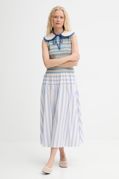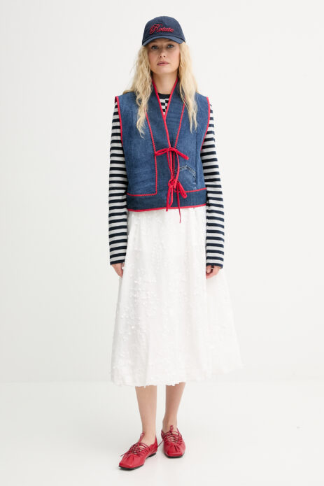Najnowsza kolekcja Renewed prezentuje projekty, które kreatywnie przemieniają denim w kamizelki i torby shopperki, a wiskozowe sukienki i koszule w letnie topy. Każdy, nawet najdrobniejszy szczegół, to ręczna praca zespołu rękodzielników INTU Circularity, którzy specjalizują się w upcyklingu, czyli czymś, co łączy prostą naprawę z tworzeniem wyjątkowego designu, poprzez haft, przeszycia lub całą gamę innych zabiegów kreatywnych.