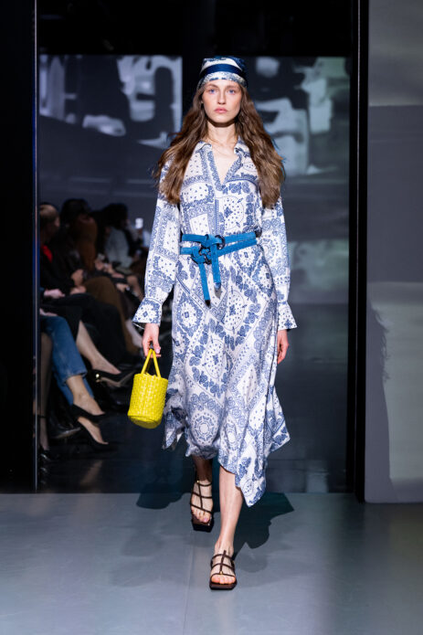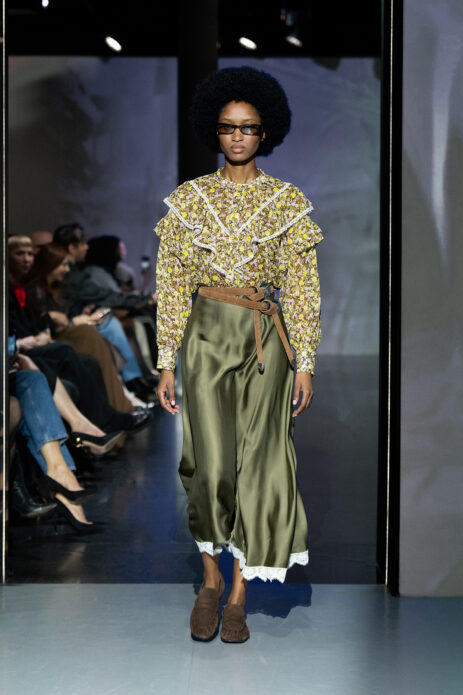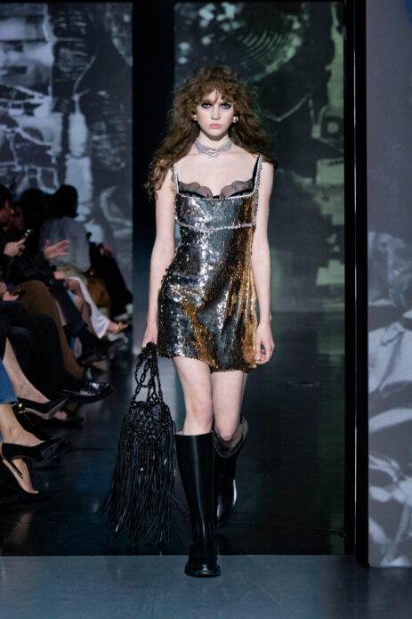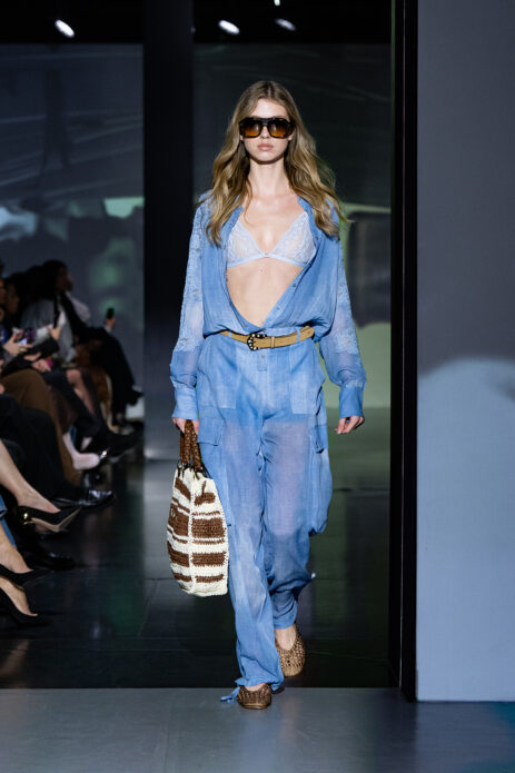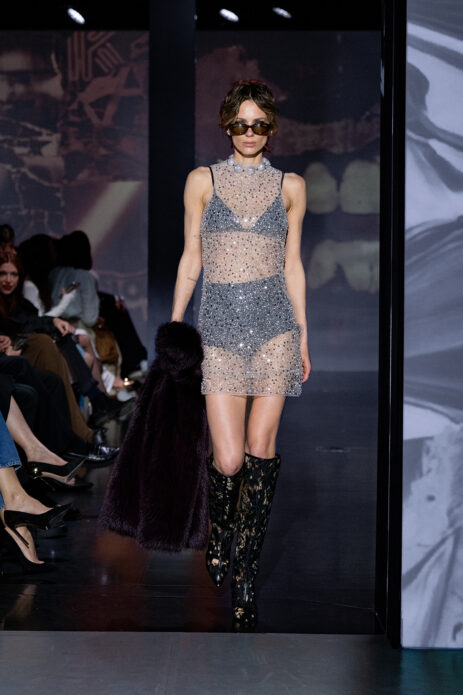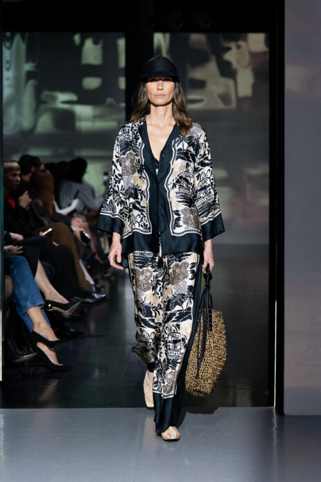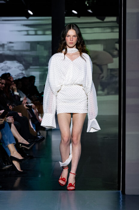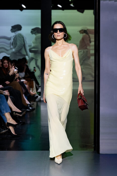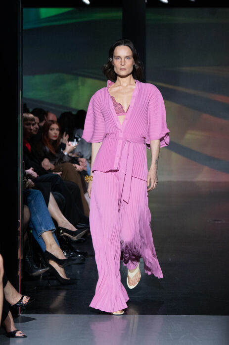 Gelato Pastels lekko wyciszyło estetycznie pokaz wprowadzając subtelną, ale bardzo świadomą zmysłowość. Pastelowe odcienie – pistacjowe, cytrynowe, malinowe – pojawiły się w bardziej kontrolowanej formie. Transparentne warstwy, satynowe wykończenia i miękkie dzianiny budowały efekt lekkości, ale bez naiwności. Kolor stał się narzędziem budowania nastroju i emocji.