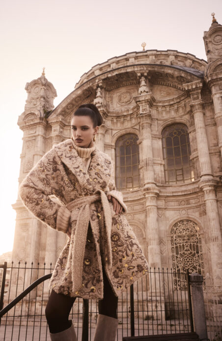 Zbliżający się sezon świąteczny wnosi do kolekcji ciepłe, naturalne barwy, które przełamują odważniejsze akcenty kolorystyczne. Laminowane tkaniny, miękki moher, denim zdobiony haftem all-over i połyskujące aplikacje sprawiają, że każda stylizacja emanuje elegancją i subtelnym luksusem. Sztuczne futra, sukienki zdobione cekinami i wysmakowane akcesoria podkreślają kobiecą pewność siebie i pozwalają przyciągać spojrzenia podczas każdego spotkania.